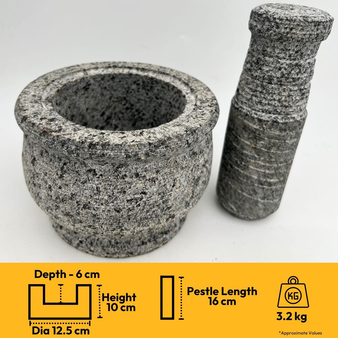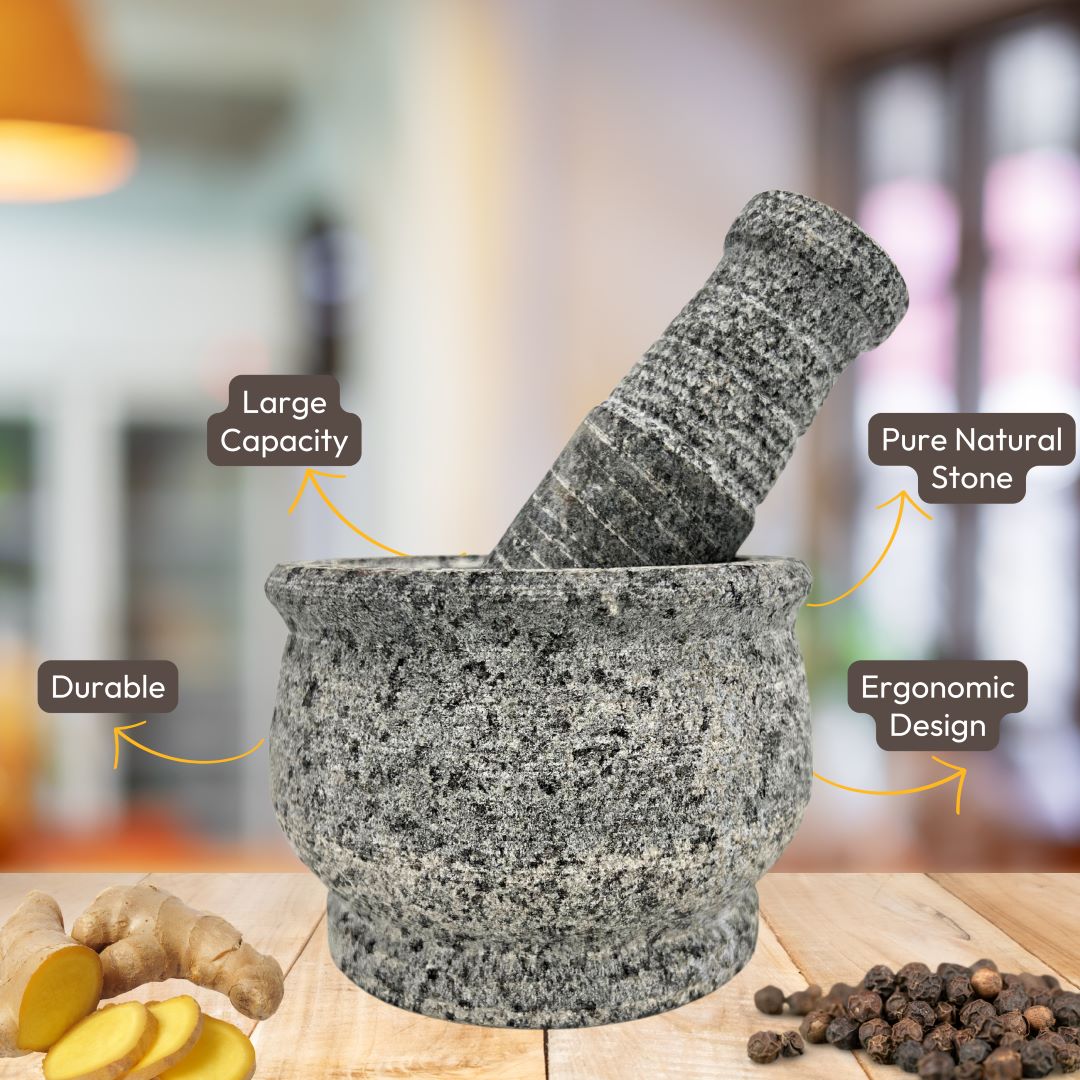 Its non-porous stone surface doesn’t absorb flavours, colours, or odours, ensuring every batch stays pure and fresh. Cleaning is very simple , just rinse with water and it’s ready for the next use. Whether you’re making everyday masala pastes or adding freshly ground spices to your favourite dishes, this Stone Mortar and Pestle Set – Modern design brings better aroma, texture and authenticity than a mixer.